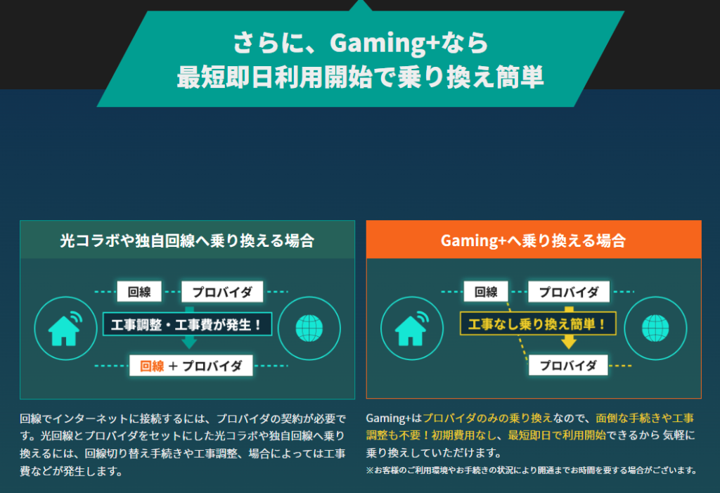 光コラボからの乗り換えであればすぐにプロバイダーの切り替えが可能なので、万が一Gaming+を辞めるとなっても簡単で難しいことはありません。