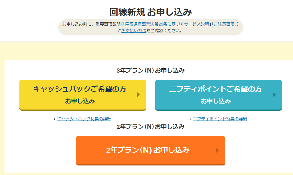 @nifty光の契約期間は2年または3年となっています。3年契約と2年契約でキャンペーン内容が異なるのご注意ください。
