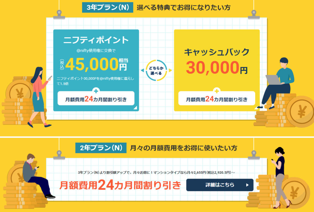 - キャッシュバック30,000円とニフティポイント進呈(45,000円相当)が選べる