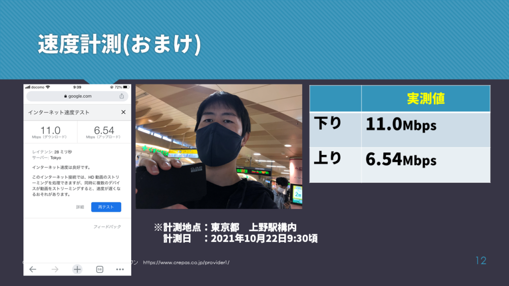 おまけですが、東京上野駅でも計測を行いました。朝の時間帯でしたが、結果は11Mbpsとそこまで速くはありませんが、遅くもないという結果でした。