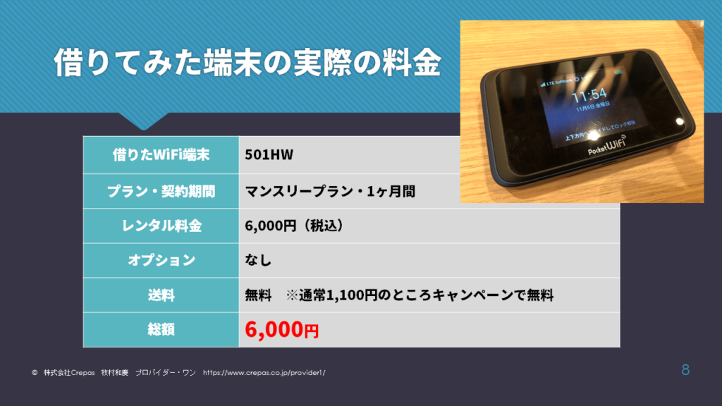 たとえは、501HWのポケットWiFiを借りると半年利用で毎月6,000円かかりますが、こちらが5,100円(税込み)となり、900円の値引きされます。